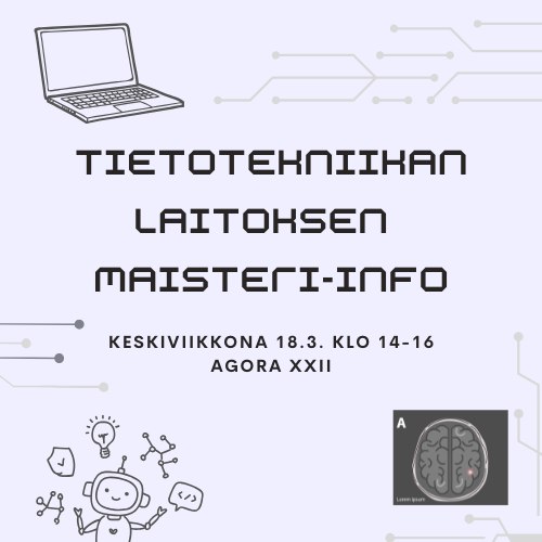 Tilaisuudessa tietotekniikan laitoksen opiskelijat kertovat omia kokemuksiaan valitsemistaan linjoista. Saavu paikalle kuuntelemaan ja kysymään siitä, millaisia maisteriopinnot tietotekniikan laitoksella oikeasti ovat.
